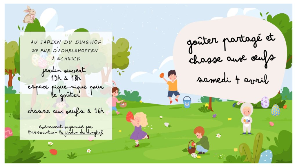 L’association du Jardin du Dinghof vous propose un goûter partagé et une chasse aux oeufs, le samedi 4 avril 2026, au Verger du Dinghof.