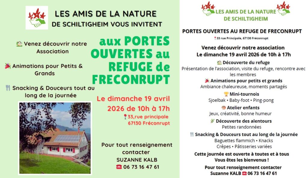 Les Amis de la Nature de Schiltigheim, vous invite à leur Portes ouvertes, le dimanche 19 avril 2026 de 10h à 17h à Fréconrupt.