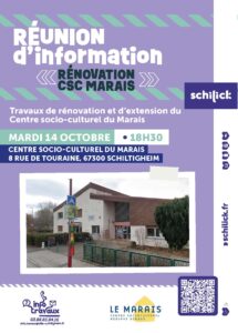 Une réunion d’information concernant les travaux de rénovation et d’extension du CSC du Marais se tiendra le mardi 14 octobre à 18h30 au CSC.