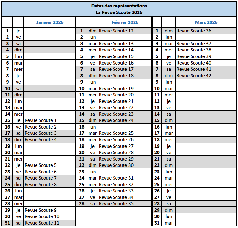 CALENDRIER DES REPRÉSENTATIONS DE LA REVUE SCOUTE @SCHILICK