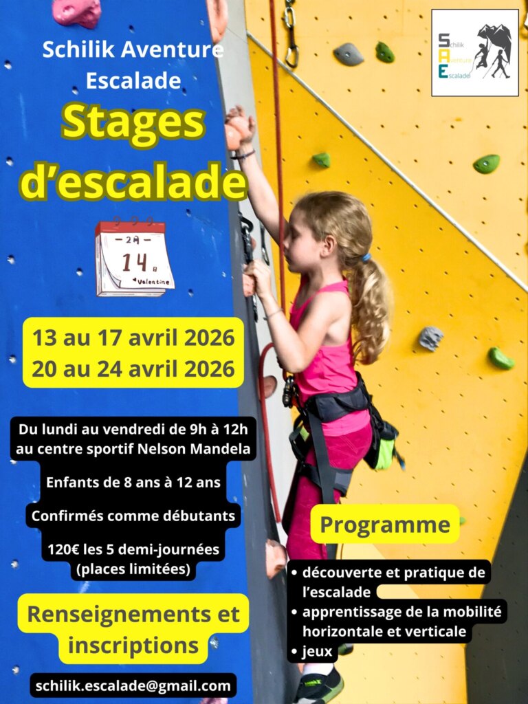 Pendant les prochaines vacances scolaires, Schilick Aventure Escalade organise deux stages d’escalade pour les enfants de 8 à 12 ans au centre sportif Nelson Mandela.