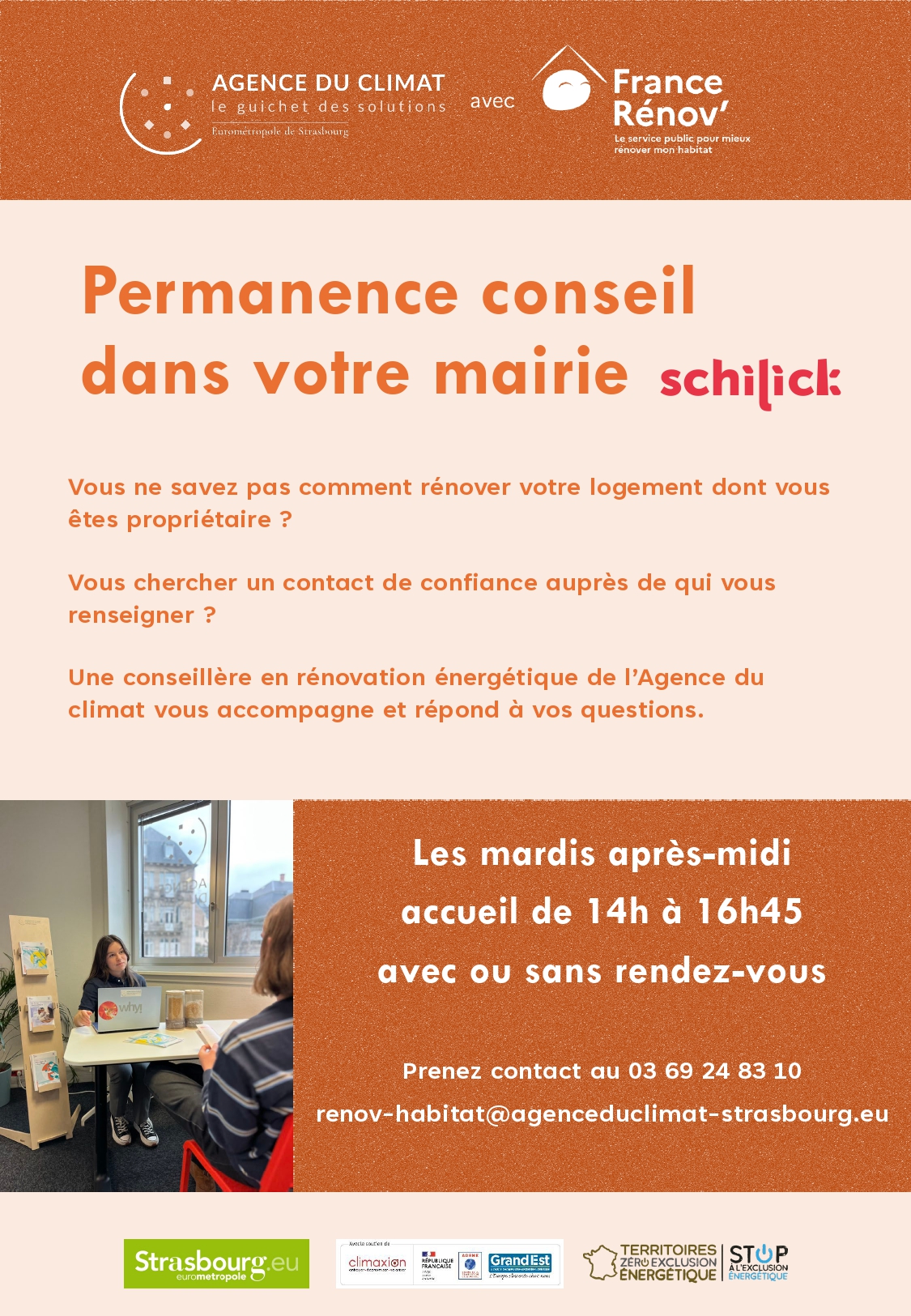 Une conseillère en rénovation énergétique de l’Agence du climat vous accompagne et répond à vos questions : les mardis après-midi de 14h à 16h45 avec ou sans rendez-vous.